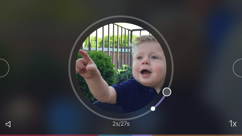 To start, click on whichever clip (the different colored circles on the bottom of the screen) you want to edit first.  The video will take up your screen and you can trim your clip to your desired length by dragging the small cursor circle back and forth the outer circle.